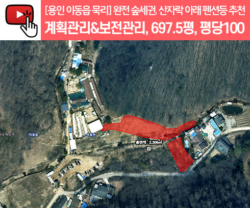 매매 : 6억9천7백(평당100)◎면적정보◎면적 : 2,306㎡(697.5평)지목 : 종교용지,전용도지역 : 계획관리,보전관리◎기타정보◎- 완전 숲세권 토지- 펜션/주말농장 등 추천- 국유지 낀 활용공간 많은 토지